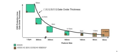 相信所有人都希望ESD防護能完全地集成到IC芯片內部,因為這樣會節省的板級空間,減少系統成本并降低設計與布線的復雜度。但從目前情況來看,前景并不樂觀。如今,IC制程工藝的進步成了片上ESD保護的一大難題。一方面,工藝的進步雖提升IC的性能與集成度并降低功耗與尺寸,但由于柵極氧化層厚度越來越薄,IC自身的ESD防護能力反而降低。另一方面,隨著IC尺寸的不斷減小,由于受到空間的限制,因此保護能力有限。