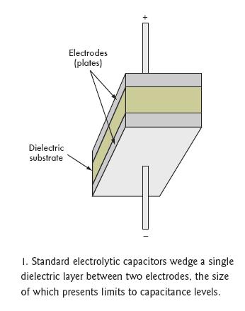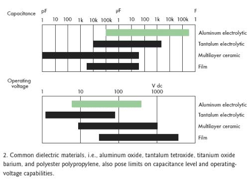 [page]標準電容的結(jié)構是在兩個附屬于金屬板上的電極之間夾一層電介質(zhì)層(圖1)。根據(jù)電容類型不同,電介質(zhì)可以是氧化鋁、四氧化鉭、氧化鈦鋇或聚丙烯聚酯,不同的材料決定了不同的容量和電壓特性(圖2)。電介質(zhì)的多少和極板間的距離也會影響電容量。然而,極板間最大允許距離限制了電介質(zhì)的數(shù)量。