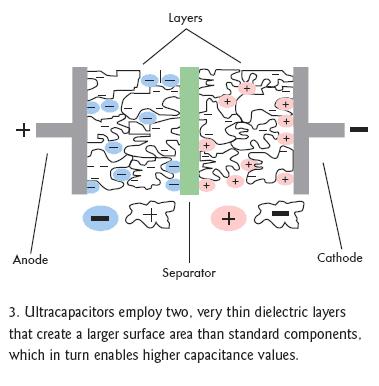 雙電層電容器(EDLC)正如它的字面意義那樣可以解決上述問題,它在相同的封裝內(nèi)增加了第二個電介層,這個電介層與第一層在中間隔離物的兩邊并行工作(圖3)。EDLC也采用無孔電介質(zhì),如活性碳、碳納米管、炭黑凝膠,并選用導電聚合物,其存儲容量要比標準的電解材料高出許多。額外層和更高效電介材料的這種組合能使電容容量提高近4個數(shù)量級。