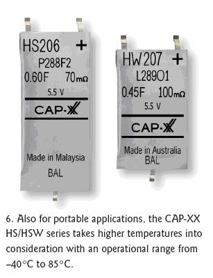同樣針對緊湊空間設計但可耐更高溫度的CAP-XX公司HS和HW系列電容器具有很薄的外殼,工作溫度范圍是-40℃到85℃(圖6)。在4.5到5.5V電壓范圍內(nèi),HW的尺寸為28.5x17mm。在5.5V電壓時的電容量可達0.4F,ESR在5.5V時可低至100mΩ。