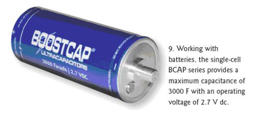 MaxwellTechnologies公司還有許多大型的具有很高容量的BOOSTCAP品牌單節(jié)電容器,不過工作電壓比較低。BCAP系列共5節(jié),在2.7Vdc的工作電壓下電容值可達650、1200、11500、2000和3000F(圖9)。這些電容的主要用途是與電池并行工作,適合要求恒定低功率放電以及峰值負載下提供脈沖功率的應用。