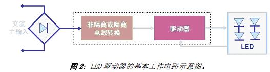 LED 的排列方式及LED 光源的規范決定著基本的驅動器要求。LED 驅動器的主要功能就是在一定的工作條件范圍下限制流過LED 的電流, 而無論輸入及輸出電壓如何變化。LED驅動器基本的工作電路示意圖如圖2 所示,其中所謂的“隔離”表示交流線路電壓與LED(即輸入與輸出)之間沒有物理上的電氣連接,最常用的是采用變壓器來電氣隔離,而“非隔離”則沒有采用高頻變壓器來電氣隔離。