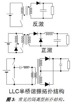 電路中通常加入了變壓器的隔離型AC-DC 電源轉換包含反激、正激及半橋等拓撲結構,參見圖3,其中反激拓撲結構是功率小于30 W 的中低功率應用的標準選擇,而半橋結構則最適合于提供更高能效/功率密度。就隔離結構中的變壓器而言,其尺寸的大小與開關頻率有關,且多數隔離型 LED 驅動器基本上采用“電子”變壓器。