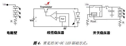 采用 DC-DC 電源的LED 照明應用中,可以采用的LED 驅動方式有電阻型、線性穩壓器及開關穩壓器等,基本的應用示意圖參見圖 4。電阻型驅動方式中,調整與LED 串聯的電流檢測電阻即可控制LED 的正向電流,這種驅動方式易于設計、成本低,且沒有電磁兼容(EMC)問題,劣勢是依賴于電壓、需要篩選(binning) LED,且能效較低。