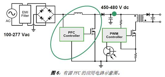 有源 PFC(見圖6)通常是作為一個專門的電源轉換段增加到電路中來改變輸入電流波形。有源PFC 通常提供升壓,交流100 至277 Vac的寬輸入范圍下,PFC 輸出電壓范圍達直流450 至480 Vdc。如果恰當地設計PFC 段,可以提供91%到95%的高能效。但增加了有源PFC,仍然需要專門的DC-DC 轉換來提供電流穩流。