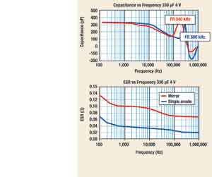 鏡像結構如果使用更薄的陽極,電容將隨頻率下降至更低。鏡像設計的共振頻率改變,其原因是目前一般的DC/DC轉換器其開關頻率的工作范圍(250~500kH)會因降低ESL而顯著升高。