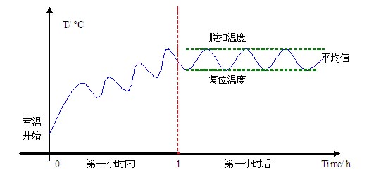 以單相馬達(dá)與自動(dòng)復(fù)位熱保護(hù)器組合為例說明,其他情況請查閱相關(guān)標(biāo)準(zhǔn)。測試在室溫環(huán)境進(jìn)行,堵轉(zhuǎn)72小時(shí),其間熱保護(hù)器必須因繞組溫度升高斷開電路又自動(dòng)復(fù)位,儀器連續(xù)記錄繞組溫度,圖-1的示意圖由經(jīng)驗(yàn)所得。整個(gè)過程到結(jié)束,必須符合以下結(jié)果: