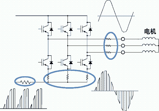 實(shí)際上,電流信號(hào)可以通過與下列結(jié)點(diǎn)相連接而被取樣:正或負(fù)DC總線、單IGBT相位腳、或電機(jī)相位超前,如圖1所示。不管在哪個(gè)DC總線上取樣的電流信號(hào),都是所有IGBT相位腳電流的矢量和。