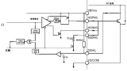 在DSH/L針腳提供主動(dòng)式偏壓結(jié)構(gòu),目的是降低IGBT處于OFF時(shí)流過二極管寄生電容和內(nèi)部上拉電阻電流的噪聲效應(yīng)。DSH/L給VB/VCC提供相應(yīng)的主動(dòng)式上拉,給VS/COM提供相應(yīng)的下拉。當(dāng)電壓超過VDESAT臨界電壓的時(shí)候,專用偏壓電路可以降低DSH/L針腳的阻抗。當(dāng)IGBT處于完全開啟的時(shí)候,感測(cè)二極管變?yōu)轫樒珼SH/L針腳上的電壓就下降了。這時(shí),偏壓電路不再起作用,目的是降低二極管的偏壓電流。