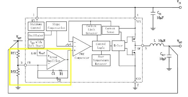 對于不同廠商設(shè)計的Buck變換器芯片,外圍電路所需要的器件會有所不同,這是因?yàn)樾酒募啥扔胁町悾热纾械膹S商會把功率管集成在芯片內(nèi)部;有的廠商會把控制部分的補(bǔ)償網(wǎng)絡(luò)集成在芯片內(nèi)部。集成度越高的芯片,外圍電路所需要的器件就越少,因此對于客戶來說,外圍器件的選擇需要根據(jù)具體芯片來決定。然而,對于任何一個輸出可以調(diào)節(jié)的Buck變換器芯片,選擇合適的反饋電阻是必不可少的。圖2是BCD半導(dǎo)體公司的Buck變換器AP3406的典型應(yīng)用圖,由于該芯片集成度很高,外圍只需要輸入電容、輸出電感、輸出電容和反饋電阻,本文就以此為例對反饋電阻的作用做簡要分析,為如何選擇反饋電阻提供參考。