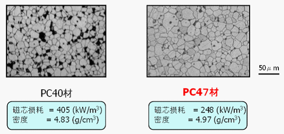 至于高性能材質的研發,設計的原理,材質研發出來,它的密度更大。拿PC40材和PC47材兩個材質高倍放大鏡成像的對比,可以發現左邊PC40材質有很多黑色的點。那些點是間隙,粒子之間存在很多間隙。右邊PC47材質黑點比PC40材小,也就是說PC47材密度會遠遠大于PC40材質,從而降低磁芯損耗,提高變換效率,降低發熱。基于材料開發及燒制因素(燒制方法、溫度條件)的最適度,實現材料的高密度設計。