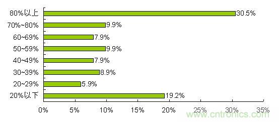 根據(jù)調(diào)查,89%的公司2011年傳感器采購(gòu)總額在5千萬以下,其中采購(gòu)總額在1千萬以下的占到69%。采購(gòu)傳感器進(jìn)口產(chǎn)品所占百分比呈現(xiàn)兩極分化,進(jìn)口產(chǎn)品所占百分比在80%以上和20%以下的情況最多,有30.5%的整機(jī)制造商傳感器進(jìn)口產(chǎn)品達(dá)到80%以上,19.5%的公司進(jìn)口產(chǎn)品在20%以下。