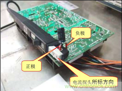 A.將電流探頭夾持待測電解電容正極PIN 腳,并且注意探頭所標方向與電容電流方向一致. 如下圖: