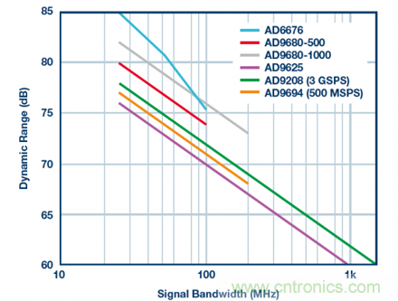 圖5顯示了多種不同高速ADC的SNR與信號帶寬的權衡關系:五個斜率遵從平坦噪底的3 dB/倍頻程調制增益,而AD6676由于噪底整形而表現出更陡的調制增益。