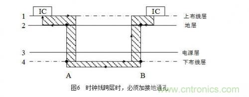 在布線時盡量少穿過孔,因為過孔阻抗和線阻抗不一樣,存在阻抗突變,從而產生駐波使信號變壞,容易形成輻射,尤其是在時鐘需要穿層時,要做技術處理,時鐘線跨層時的處理如圖6所示。