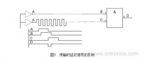 (3)保證信號在PCB上可靠的傳輸,確保信號的完整性。這里面主要的問題一般包括時延、阻抗不匹配、地彈跳、串音等。這不但影響到電子器件的穩定工作,還會產生電磁干擾。一般在高速邏輯設計中最容易碰到時延問題,處理不好會產生不希望的脈沖干擾。傳輸時延對信號的影響如圖5所示。