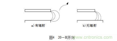 (1)20-H原則,決定印制線條間的距離,表述如下:所有的具有一定電壓的PCB都會向空間輻射電磁能量(如圖4a),為減小這個效應,PCB的物理尺寸都應該比最靠近的接地板的物理尺寸小20H(其中H是兩層PCB的間距),即3mm左右,這樣可使輻射強度下降70%(如圖4b)。20-H原則示意圖如圖4所示: