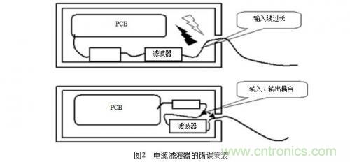 (3)在電源電路(尤其是開關電源中),操縱電路,控制電路,以及轉換電路中消除產生的干擾。在工程實際中,一個最值得注意的地方是電源濾波器的安裝,常見的濾波器的錯誤安裝如圖2所示。