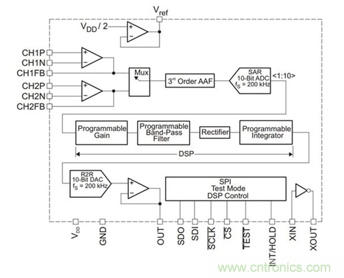 表 2 顯示了各種頻率輸入信號(hào)的輸出信號(hào)振幅的測(cè)試數(shù)據(jù)。 已對(duì)每個(gè)器件的帶通濾波器進(jìn)行編程,使其具有 6.94kHz 的中心頻率,因此應(yīng)抑制遠(yuǎn)離該中心頻率的輸入信號(hào)。