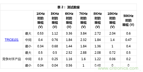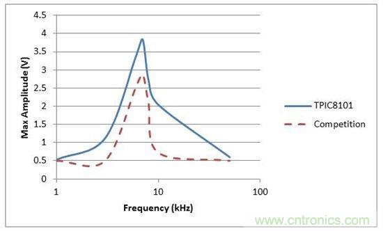 圖 2 顯示了表 1 中的結(jié)果。 噪聲等級(jí) () 在兩個(gè)器件之間大概是相同的,因?yàn)檫h(yuǎn)離中心頻率的振幅基本相同。 在中心頻率,TPIC8101 具有更高的振幅,這意味著其 SNR 要優(yōu)于競(jìng)爭(zhēng)產(chǎn)品。