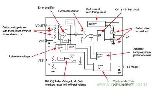 內(nèi)部電路由基準電壓、誤差放大器、振蕩器、指示燈波形、PWM比較器、UVLO、限定電流電路等構(gòu)成,固定輸出電壓型由激光微調(diào)固定調(diào)整了內(nèi)部電阻R1/R2的電阻比。工作電壓范圍在1.8V~6V之間。此外,內(nèi)部調(diào)整了放大器的相位補償及送信頻率、軟啟動時間等,可以完全無須調(diào)整地使用。