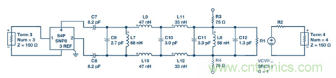 4. 對(duì)于子系統(tǒng)級(jí)仿真,應(yīng)在輸入端增加ADL5201 DGA S參數(shù)文件,并使用壓控電壓源來(lái)模擬濾波器輸出端的 AD6641 ADC。為將低通濾波器變?yōu)閹V波器,增加兩個(gè)分流電感:L7與C9并聯(lián),L8與C11并聯(lián)。C12代表AD6641輸入電容。R3和R4是放在AD6641輸入端的兩個(gè)負(fù)載電阻,用作濾波器的負(fù)載。AD6641輸入為高阻抗。調(diào)諧后的情況參見圖19。
