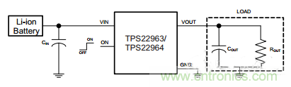 TI負載開關是用來接通和關閉電源軌的集成電子中繼器。大多數基本負載開關采用小型集成封裝,由四個引腳組成:輸入電壓、輸出電壓、使能、和接地,并且包含多重特性,其中有反向電流保護。圖4顯示了一個用來阻斷反向電流的負載開關。