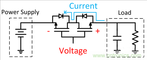 為了在FET關閉時阻斷兩個方向上的電流,你還可以將FET背靠背連接。與二極管解決方案相比,電源到負載的壓降更低,不過這種實現方式占用了大量的電路板面積。圖3顯示了用來阻斷反向電流的背靠背FET示例。