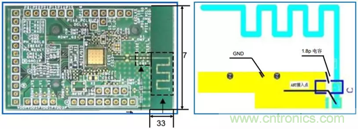 曲流型天線的長度比較難確定。長度一般比四分之一波長稍長,其長度由其幾何拓撲空間及敷地區(qū)決定。曲流型天線一般是PCB封裝,即板載天線。和倒F型一樣,天線一般放置在PCB頂層,鋪地一般放在頂層并位于天線附近,但天線周圍務(wù)必不能放置地,周圍應(yīng)是凈空區(qū)。如圖2,圖3: