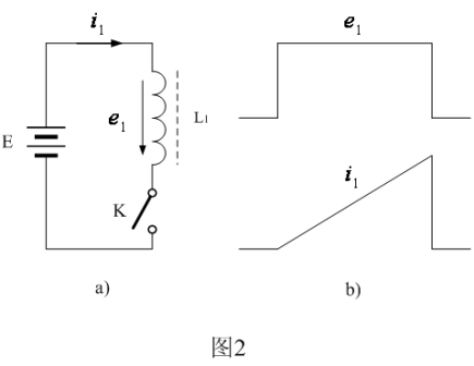 在圖1中,當輸入電壓E加于開關電源變壓器初級線圈N1的兩端時,由于變壓器次級線圈產生的電動勢與流過二極管的電流方向正好相反,相當于所有次級線圈均開路,此時開關變壓器相當于一個電感L1。其等效電路如圖2-a) 所示,圖2-b) 是開關接通時,電感兩端的電壓和流過電感L1的電流。