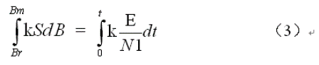 上式中,k是一個與單位制相關的系數,S為變壓器鐵心的導磁面積,B為磁感應強度,也稱磁通密度,即:單位面積的磁通量。把(2)式代入(1)式,并進行積分: