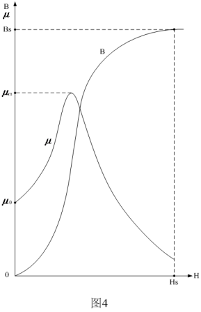 由圖4中可以看出,導磁率最大的地方并不是磁感應強度或磁場強度最小或最大的地方,而是位于磁感應強度或磁場強度的某個中間值的地方。當導磁率達到最大值之后,導磁率將隨著磁感應強度或磁場強度增大,而迅速下降;當導磁率下降到將要接近0的時候,我們就認為變壓器鐵芯已經開始飽和。如圖中Bs和Hs。