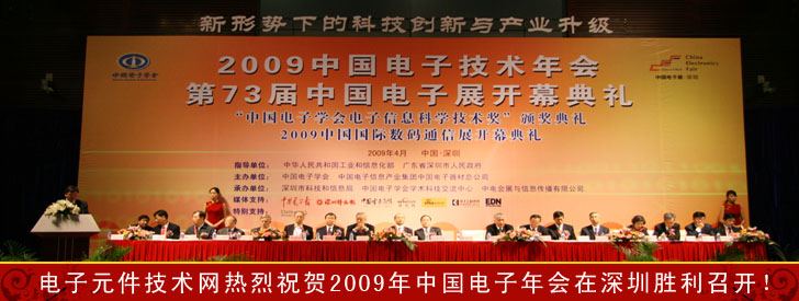 4月9日,“2009年中國電子技術(shù)年會(huì)”與“第73屆中國電子展暨2009中國國際數(shù)碼通信展”開幕式同時(shí)在會(huì)展中心隆重召開。本屆年會(huì)由工業(yè)和信息化部、深圳市人民政府指導(dǎo),中國電子學(xué)會(huì)、中國電子信息產(chǎn)業(yè)集團(tuán)中國電子器材總公司主辦,電子元件技術(shù)網(wǎng)(www.tiangongcn.com)是活動(dòng)特別支持網(wǎng)站,年會(huì)以“新形勢(shì)下的科技創(chuàng)新與產(chǎn)業(yè)升級(jí)”為主題。原信息產(chǎn)業(yè)部部長、中國電子學(xué)會(huì)理事長吳基傳,工業(yè)和信息化部副部長婁勤儉,工業(yè)和信息化部有關(guān)司局領(lǐng)導(dǎo),深圳市、中國電子信息產(chǎn)業(yè)集團(tuán)公司有關(guān)領(lǐng)導(dǎo)及多位院士、專家出席了會(huì)議。