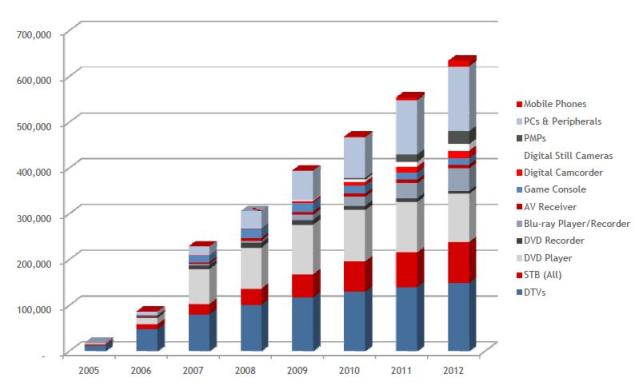 圖2 2005年~2012年預(yù)計(jì)HDMI裝置出貨量