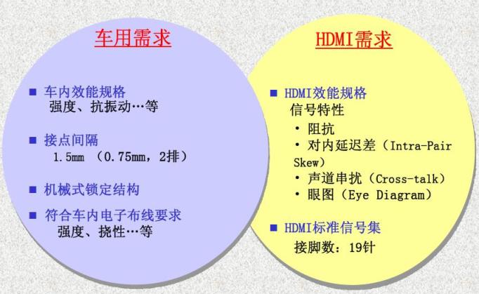 車用視頻系統(tǒng)越來越受歡迎,因此汽車生產(chǎn)商希望在他們的汽車?yán)锛蒆DMI連接功能。HDMI1.4規(guī)格為回應(yīng)汽車生產(chǎn)商的需求,提出了功能強(qiáng)大的新型車用連接系統(tǒng),可在車內(nèi)座椅后方或駕駛面板上的顯示設(shè)備上提供真高清視頻,并同時(shí)符合汽車道路駕駛中較為嚴(yán)苛的性能要求。
