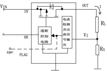 圖2是一種帶過流保護的負載開關結構框圖,圖2中,RL是負載,RS是電流檢測電阻。流過RS的電壓降VRS與電流I成比例,此電壓VRS輸入負載開關VI端。若內部電流檢測電路檢測出有過流狀態,輸出過流信號(電平信號)給通、斷控制電路,關斷負載開關。
