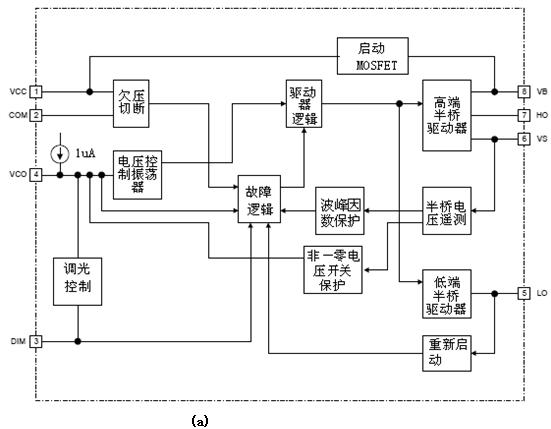 IRS2530D和IRS2158D為600V控制IC。IRS2530DDIM8是一種采用緊湊型8管腳尺寸半橋式驅(qū)動(dòng)器的線性調(diào)光鎮(zhèn)流器控制IC。它只需要幾個(gè)小型外部元件,顯著地簡(jiǎn)化和縮小了電路設(shè)計(jì),同時(shí)可實(shí)現(xiàn)10%的調(diào)光系統(tǒng)性能。圖3(a)為引腳功能示意圖。[page]
