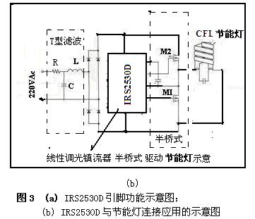 從圖3(a)可知,IRS2530D為8引腳控制IC,采用IR的專利鎮(zhèn)流器和高壓技術(shù)。一個(gè)高壓管腳可檢測(cè)半橋電流和電壓,以實(shí)現(xiàn)必要的鎮(zhèn)流器保護(hù)功能;DC調(diào)光輸入電壓基準(zhǔn)與AC燈電流反饋相結(jié)合,可以實(shí)現(xiàn)單管腳調(diào)光;IRS2530D還具有內(nèi)部非零電壓切換保護(hù)和內(nèi)部振幅因數(shù)保護(hù),防止燈泡故障損壞鎮(zhèn)流器。圖3(b)為IRS2530D與節(jié)能燈連接應(yīng)用的示意圖。