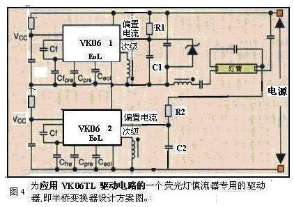圖4為應(yīng)用VK06TL驅(qū)動(dòng)電路的一個(gè)熒光燈慎流器專用的驅(qū)動(dòng)器,即半橋變換器設(shè)計(jì)方案圖。