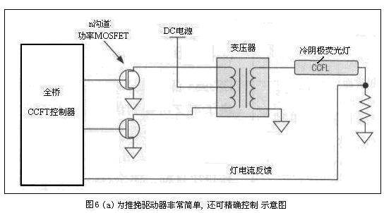 之所以考慮推挽驅(qū)動(dòng)器,因它有很多好處。這種架構(gòu)只用到n溝道MOSFET(見(jiàn)圖6(a)所示),這有利于降低成本和增加逆變器效率。它很容易適應(yīng)較高的逆變器直流電源電壓。采用更高的逆變器直流電源電壓時(shí),只需選擇具有合適的漏-源擊穿電壓的MOSFET即可。不管逆變器的直流電源電壓如何,都可采用同樣的CCFL控制器。但采用n溝道MOSFET的全橋和半橋架構(gòu)就無(wú)法做到這一點(diǎn)。對(duì)于LCD電視非常理想,因?yàn)殡娨曋械哪孀兤髦绷麟娫措妷和ǔ?huì)被穩(wěn)定在±20%。