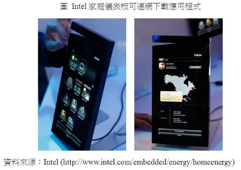 如同前述的家庭能源管理項目,Intel儀表板透過ZigBee無線技術連結家中的各項家電,監控用電狀況。此外,透過WiFi連結家中寬頻網路,可與當地的電力公司進行資訊傳遞或更新(或透過Zigbee技術與智慧電表連結,進一步與電力公司連線)。而透過儀表板上顯示的差異電價時段或市面上各項家電的耗能(節費)資訊,儀表板可以提供使用者用電與家電購置的建議,甚至可協助計算需使用多久的時間才能回本。