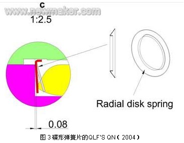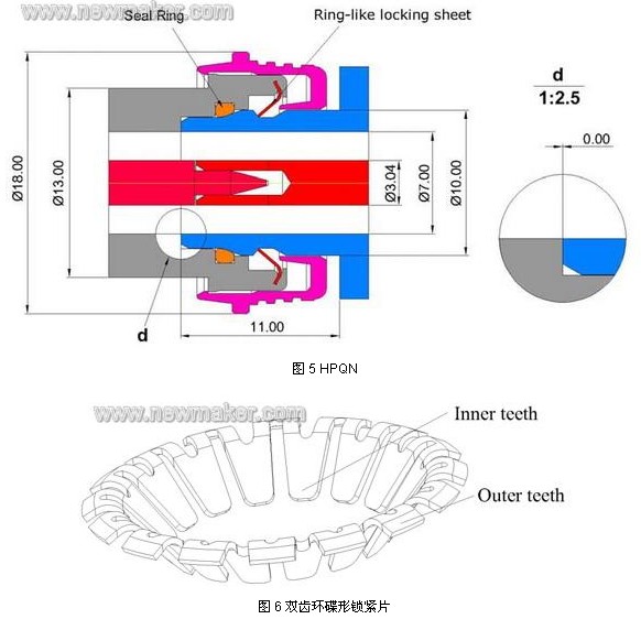 繼 SnapN 之后,07 年Anoison 推出了HPQN 設計,該設計在公頭內嵌入一雙齒環碟形鎖緊片(如圖6),當公頭和母頭配合后, 固定在公頭上的雙齒環碟形鎖緊片緊扣在母頭斜面上,其內齒的端面對母頭產生推力作用,使外導體的端面之間緊密接觸,間隙為0。并且雙齒環碟形鎖緊片相鄰的內齒長度有差異,使鎖緊時內齒停留在母頭斜面的不同圓周上。這種設計利用雙齒環碟形鎖緊片內齒的彈力和母頭斜面的支撐力,巧妙地實現了公頭和母頭端面之間的保持力和接觸壓力,并能達到非常好的抗震效果。該設計的力學原理很簡單,但是鎖緊片與母頭相對最佳位置的數據需要經歷大量的試驗。