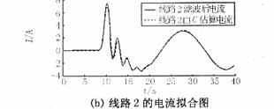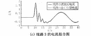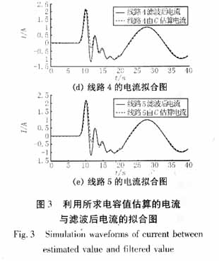 對(duì)上述方法用Matlab編程,對(duì)仿真數(shù)據(jù)進(jìn)行分析,求解系統(tǒng)對(duì)地電容值。考慮到噪聲污染以及各種隨機(jī)干擾的存在,先對(duì)故障數(shù)據(jù)進(jìn)行數(shù)字濾波,將17次以上的諧波去除后再對(duì)仿真或?qū)崪y(cè)數(shù)據(jù)進(jìn)行運(yùn)算。本例所得由電容所計(jì)算電流與濾波后電流擬合波形如圖3所示(本文對(duì)數(shù)據(jù)濾波時(shí)采用的是巴特沃思濾波器,除去9次諧波以上的高次諧波)。