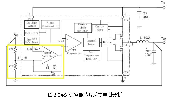 Buck變換器由于具有效率高的優(yōu)點而被廣泛應(yīng)用于手機(jī)、GPS、MP3等移動多媒體設(shè)備上,目前很多電源管理芯片制造廠商都推出了不同電流能力的Buck變換器,這類變 換器雖然在電流能力和保護(hù)功能方面存在一些差異,但是他們電路的主框架結(jié)構(gòu)是基本一致的,主要可以分為兩個部分:一是實現(xiàn)電能轉(zhuǎn)換的主功率部分,另一部分 是實現(xiàn)負(fù)反饋控制的控制電路。下圖是BCD半導(dǎo)體公司的Buck變換器AP3406的典型應(yīng)用圖,黃色框里是對反饋電阻的作用做簡要分析。