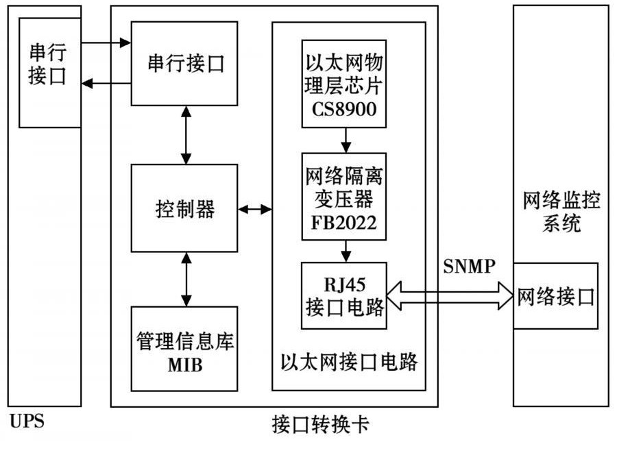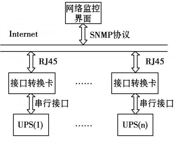 不間斷電源(UPS)能夠給計算機等電力電子設備提供持續穩定的不間斷電源供應,以避免因供電不穩定時而造成的設備損壞。但是由于UPS有限的備用時間,以及在工作中可能存在的各種異常情況,使得管理人員必須及時準確地了解設備運行時的電力環境,掌握UPS的工作狀況。目前大多數UPS監控系統是通過RS232或RS485的串行接口對UPS進行人工值守的方式進行監控。但這兩種接口都有傳輸距離的限制,不能實現任意距離的分散式遠程監控。針對這一問題,本文提出了一種基于SNMP網絡管理協議的UPS監控系統的設計方案,設計了集成SNMP協議的硬件接口轉換卡,使得僅擁有串行接口的UPS具有連網能力,從而實現了UPS的網絡管理和監控。