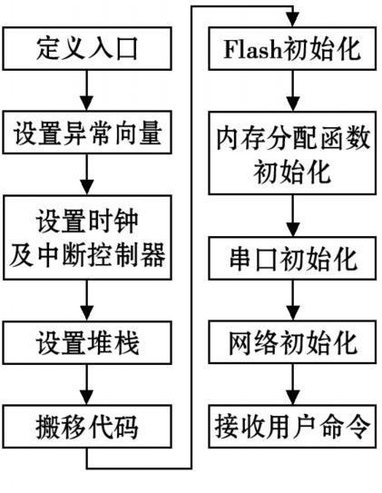 本設計中采用了帶有SNMP協議的μClinux操作系統,實現方式簡單。不僅完成了串行接口到網絡接口的轉換,還使用戶可以通過監控界面按照SNMP協議標準進行統一管理。對于μClinux系統U-boot是最合適的Bootloader,其設計過程如圖5所示。