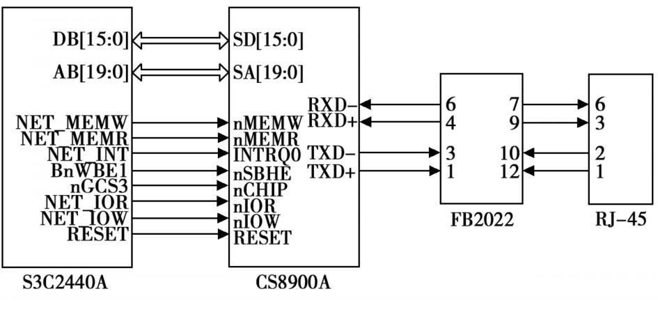 由于處理器內并未提供物理層接口,因此需外接一片物理層芯片,以提供以太網的接入通道。如圖2所示,以太網接口電路由以太網物理層芯片CS8900A,網絡隔離變壓器FB2022和RJ45接口所組成。