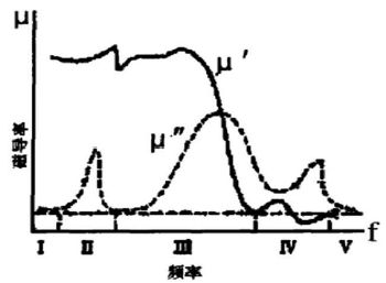 圖 3 是磁導(dǎo)率的頻散特性曲線,它可分為Ⅰ-Ⅴ個(gè)區(qū)域來分析。可見,在一定的頻率范圍內(nèi) μ'''' 值(在某一磁場(chǎng)下的磁導(dǎo)率)保持不變,然后隨頻率的升高磁導(dǎo)率 μ'''' 有一最大值。頻率再增加時(shí),μ'''' 迅速下降。代表材料損耗的虛數(shù)磁導(dǎo)率 μ" 在低頻時(shí)數(shù)值較小,隨著頻率增加,材料的損耗(即μ")增加。