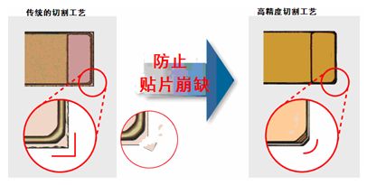 近年來,智能手機市場的需求迅猛增長,多功能化使手機產品的零部件數量增加,因此,可高密度安裝的超小型零部件的需求隨之增加。但是,以現有的制造技術,切割工藝中的封裝尺寸公差較大,達±20μm,不僅如此,還存在貼片崩缺等各種課題,業內認為0402尺寸以下的開發是非常困難的。