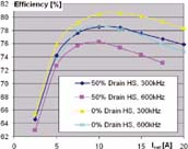 - 在300kHz、12A條件下,漏極電感的50%比0%的效率將減少7%。由于MOSFET溫度過高,15A以上便無法進行試驗。